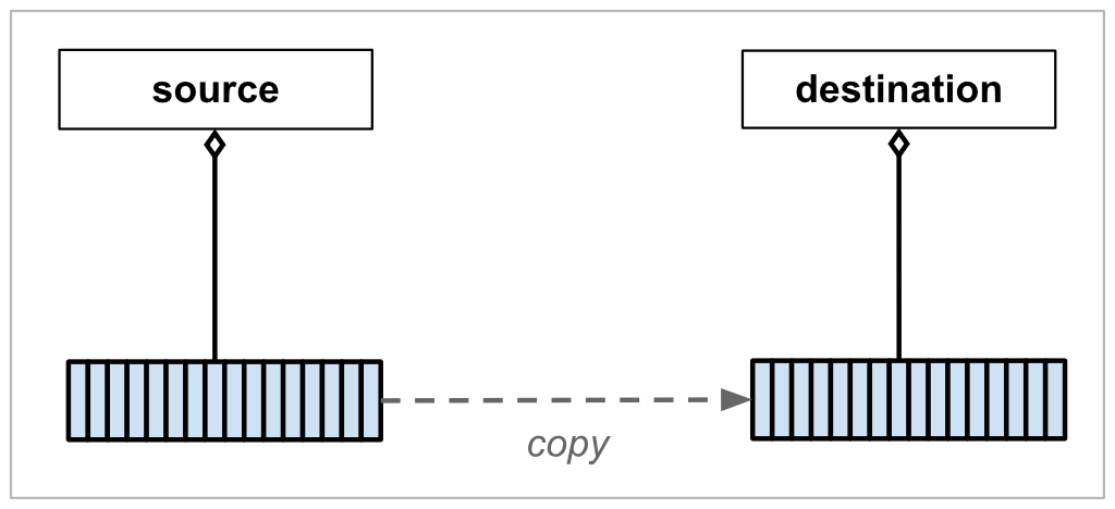 In the same way, the state being transferred between objects in C++ could be ownership of a resource, such as a block of heap memory. The following diagrams illustrate the difference between a conventional deep copy and a move: