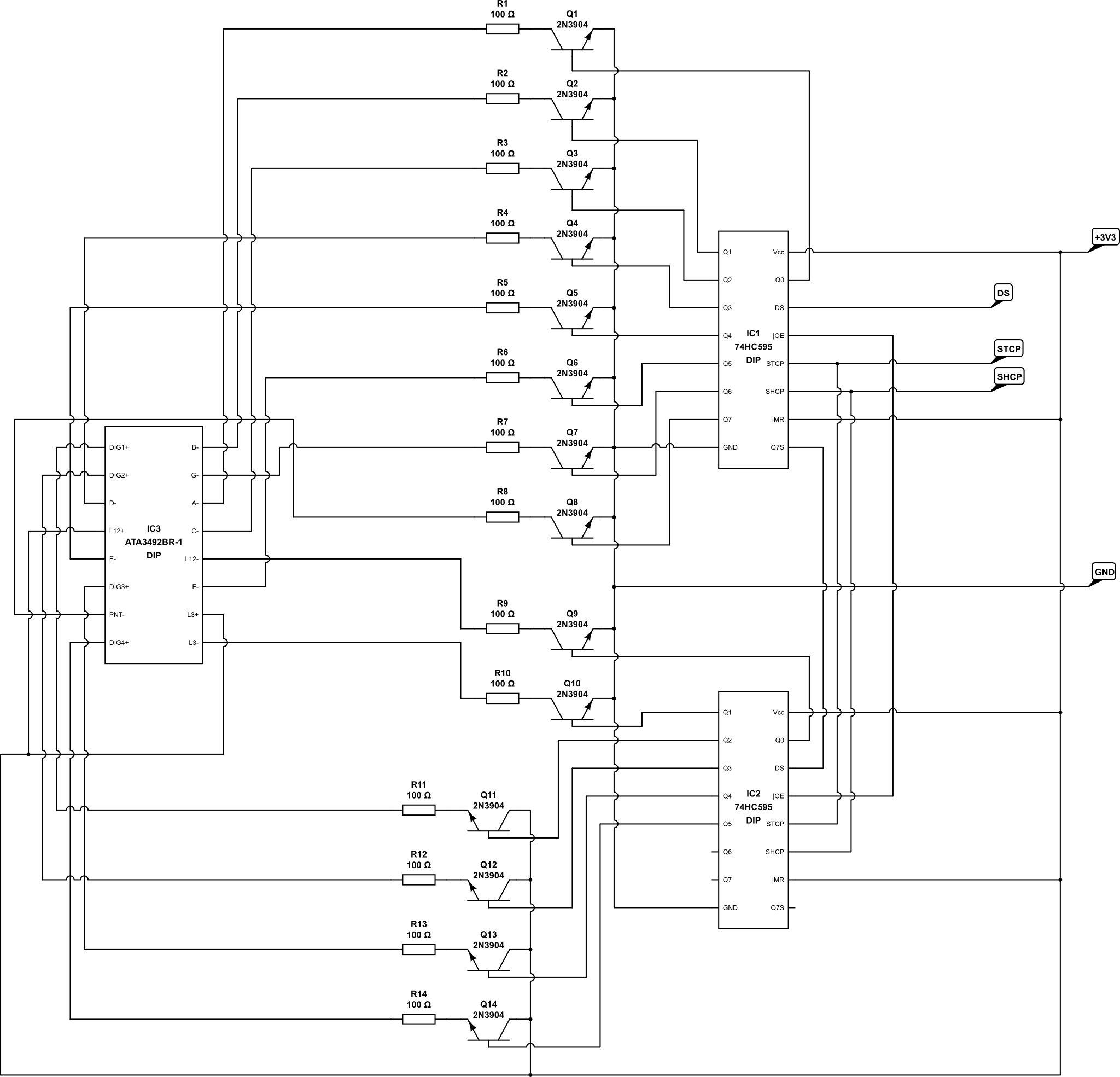 IC1 and IC2 are the shift registers, and IC3 is the numeric display. Connections DS, STCP, and SHCP go to GPIO pins on the Raspberry Pi.