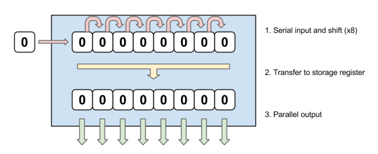 In the case of a serial-to-parallel shift register, you push data onto the beginning of the register, one bit at a time. Each time you do that, the existing data shuffles along to make room. Typically, you keep going until you’ve filled up the register, and then trigger a transfer.