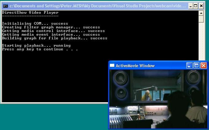 The results came together remarkably easily. I created a console application which sets up DirectShow, and then plays a video from a file in a small window. You can see a screenshot of it below. Click here view the source code. It was developed in MS Visual Studio 2003.